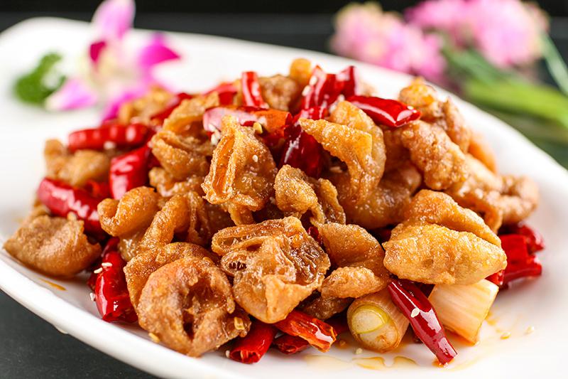 5、锅中留底油加入花椒和干辣椒炒出香味,放入炸好的肥肠,加5克盐、3克鸡精、2克白糖,小葱,红油翻炒均匀即可。