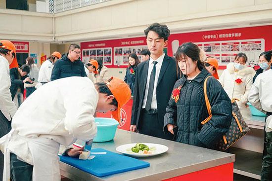 随后,家长们在老师的引导下走进实训厅,近距离观摩孩子们的炒菜实操课程。实训厅内,学子们分工明确,有的负责食材预处理,有的专注调控火候,有的精心调味摆盘,每一个步骤都有条不紊。老师在一旁巡回指导,及时纠正操作细节,耐心讲解烹饪技巧。