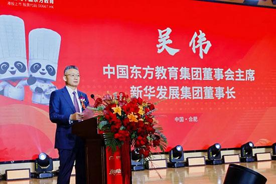 新东方烹饪教育产教融合共同体启动暨千企万岗优才计划发布会”隆重举行。中国东方教育集团董事会主席、新华发展集团董事长吴伟,中国商业联合会副会长潘炜,中国饭店协会会长陈新华,华润万家有限公司党委委员、副总经理李敬尧,安徽省人社厅职业能力建设处三级调研员马军,合肥市人力资源和社会保障局职业能力建设处副处长董选慧,中国东方教育集团总裁许绍兵,集团副总裁杨定峰,集团首席财务官欧阳兆基,集团董事会秘书毛超圣,集团烹饪第二事业部总经理吴莉,集团烹饪第一事业部常务副总经理姚忠琼等领导及行业协会负责人、知名企业代表、媒体及全球杰出校友汇聚一堂,共同见证